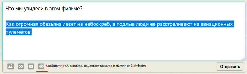 Работает очень просто. Выделяете текст, который нужно поместить под спойлер, нажимаете пиктограмму "спойлер". (Если пиктограмма представляет собой просто темный квадратик, нажмите Ctrl+R для перезагрузки страницы.)