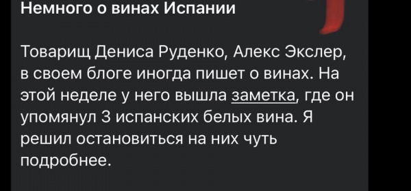 Эх, я бы тоже сейчас подробно остановился на трёх бутылках испанского белого, которые упомянул приятель Дениса Руденко, но работа, чёрт бы её подрал...