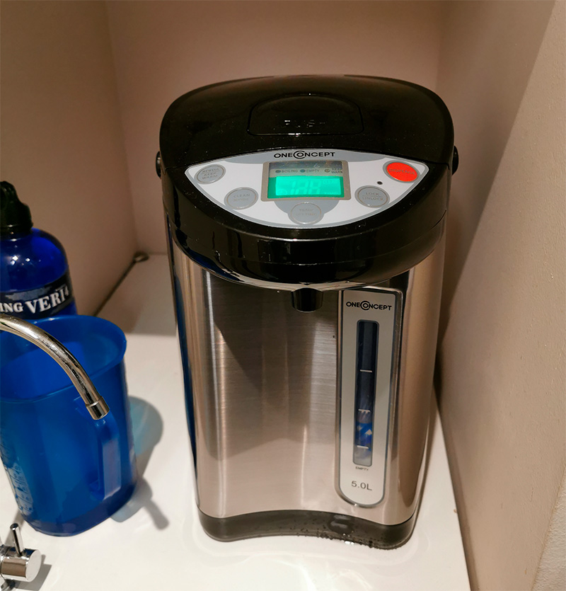 Начал искать термопот. Такой же не нашел, да и его не очень-то и хотел - он все-таки заметно подшумливал, когда подогревал воду. (Я не о первичном нагреве, при котором все термопоты шумят, а о поддержании уже нагретой воды нужной температуры - данный термопот при подогреве издавал негромкие щелкающие звуки). А в испанском Amazon с термопотами не разгуляться, предложений очень мало. Вот в немецком - предложений полно.