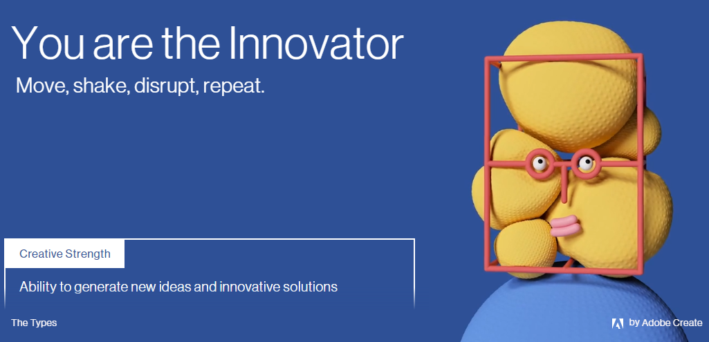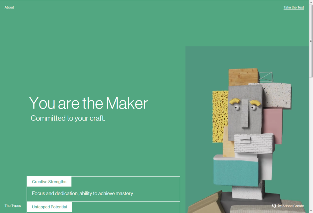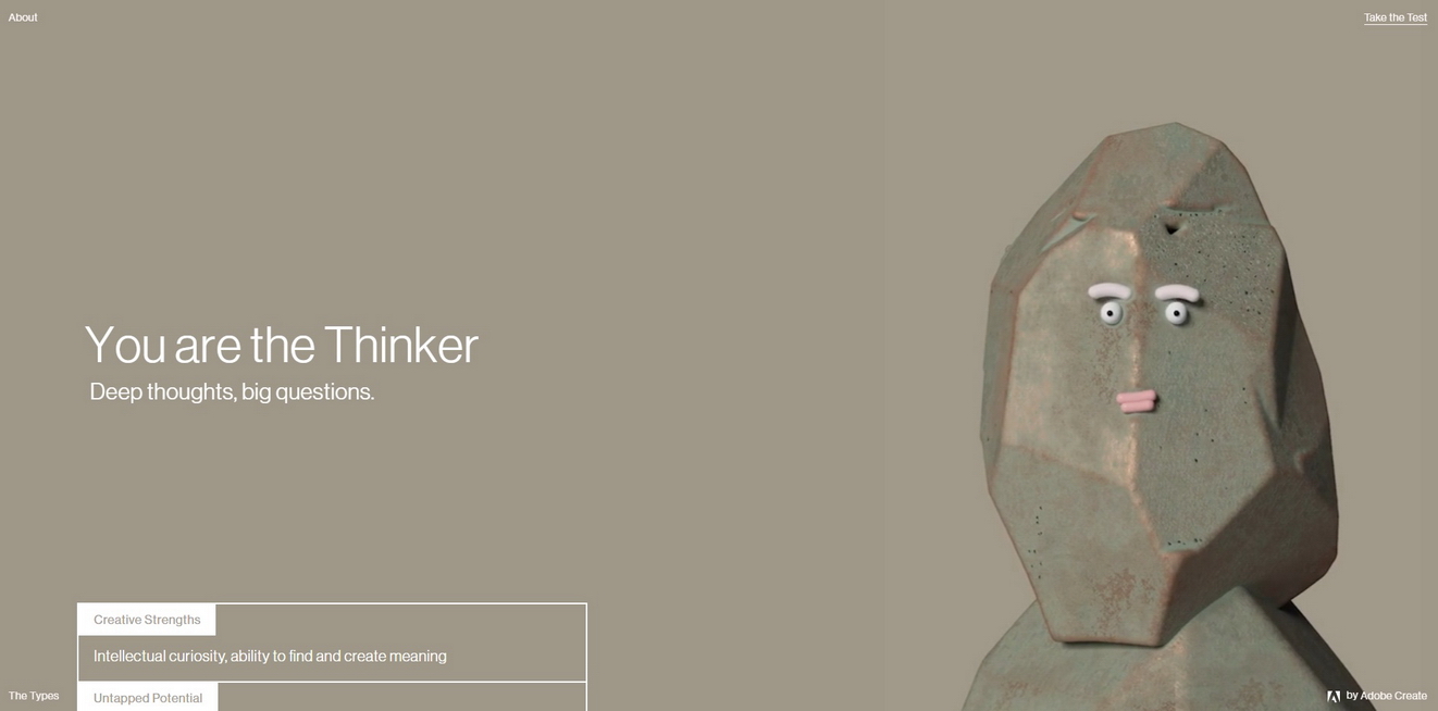 У Димы Чернышёва увидел ссылку на интересный и очень красивый тест от Adobe на ваш креативный тип - mycreativetype.com. На английском, но вопросы не слишком сложные. Правда, за парой терминов пришлось все-таки залезть в словарь.