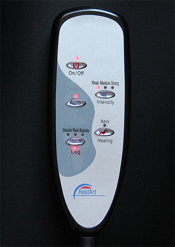 На пульте управления - несколько кнопок: интенсивность (три уровня), автомат, прогрев области шеи, ручной режим с выбором точки приложения массажа.