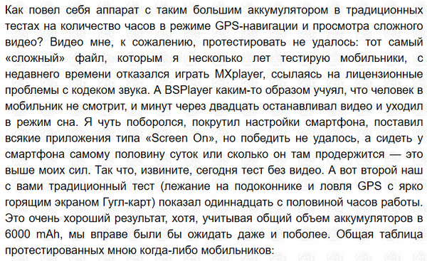 Вообще, имхо, даже если бы он запустил тест видео, и даже если бы GPS проверял на реальной нагрузке - тестирование вышло бы сильно однобоким. И потому что у конкурентов есть развитые технологии энергосбережения, и потому что аккумуляторы бывают разные, и экраны.