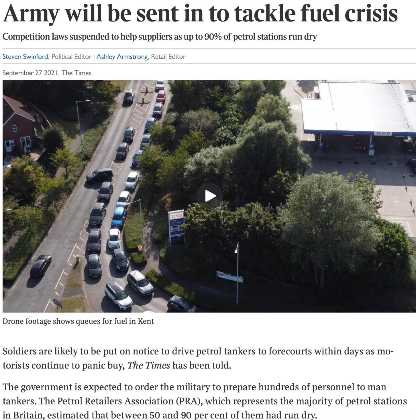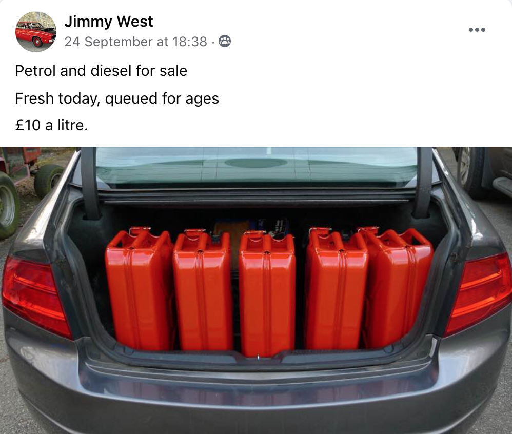 Как я понял, истерию во многом спровоцировали СМИ, выступив с заголовками типа "На заправках кончается бензин". На некоторых заправках и правда были проблемы с доставкой, но это уже продолжалось неделями. А тут народ подорвался, и всё заверте...