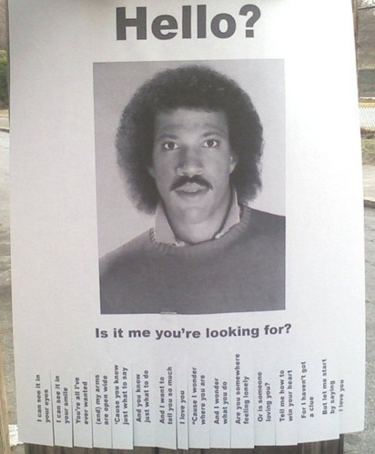 На листе с "объявлением" - текст припева песни "Hello" в исполнении Lionel Richie. В нижней части (где отрывашки) - две версии припева: в начале песни и в конце.