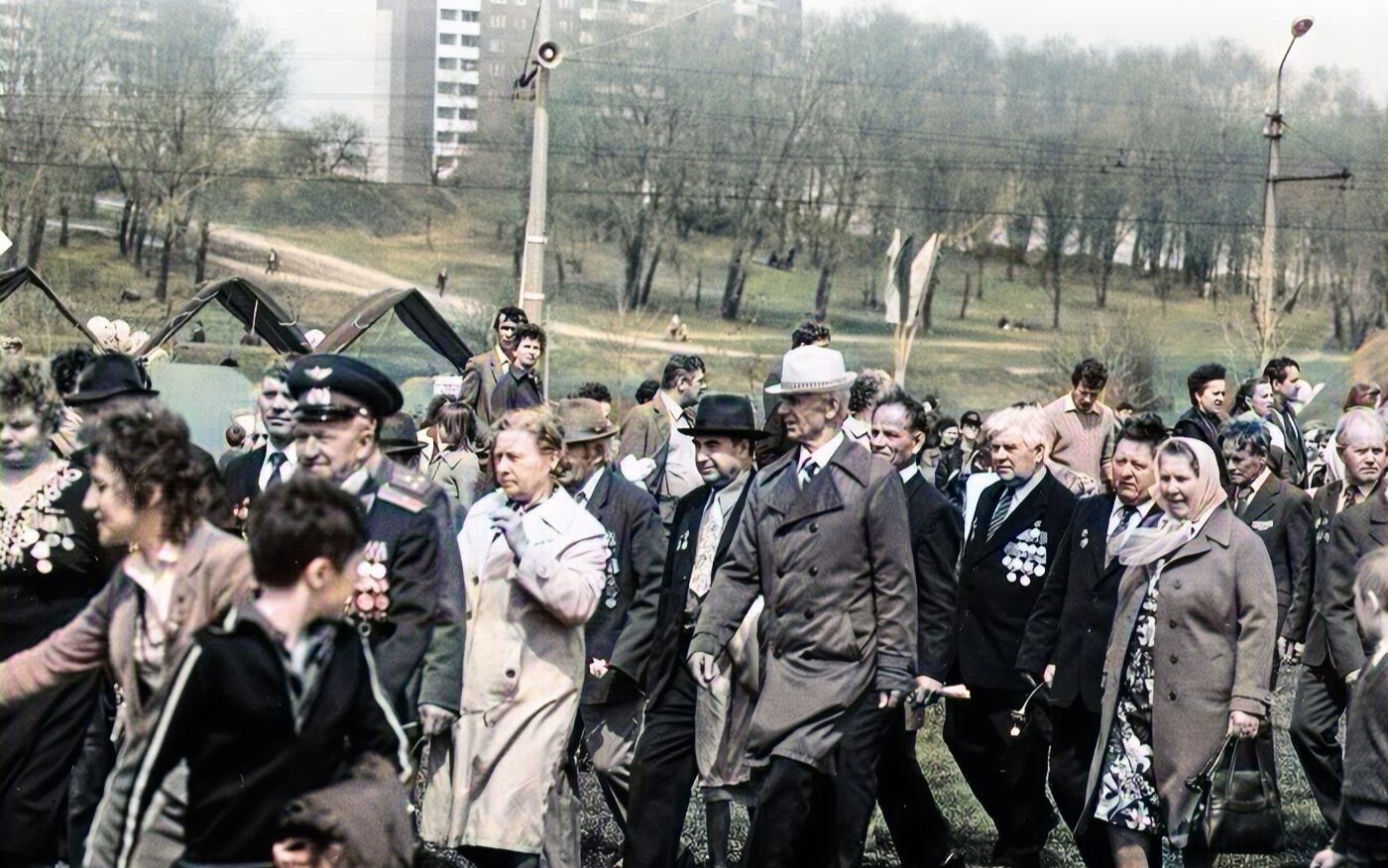 Видимо у всех по разному. У нас в школе перед 9 Мая делали типа утренника, где школьники читали стихи о войне, пели песни, отличников (в нашем классе таковых не было и мы дико завидовали А- классу, который фактически в полном составе уходил со 2-3 урока) отпрашивали с уроков и вели в парк возложить цветы к памятнику погибшим. Встреча с ветераном у нас была один раз за все мои 10 лет учёбы. А в сам день у нас никакого официоза, никого не гнали в колонну демонстрантов. Все ходили обычно семьями посмотреть парад, т.к. мы жили в военном городке, у нас каждое 9 Мая было торжественное прохождение военных, потом в колонне шли ветераны, тогда ещё настоящие. А потом все расходились по домам, иногда к нам приходили гости. Всё было тихо, спокойно, даже музыку никто громко не включал.