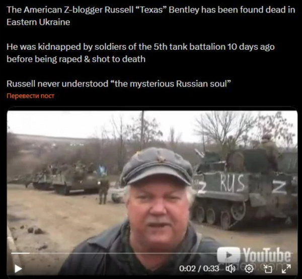Помните историю с американцем Расселом Бентли, который стал фанатом руzzкого мира, приперся в 2014 году воевать в Донецк, а потом стал работать на всякие пропагандистские издания? В апреле этого года он был задержан в Донецке танкистами из 5-й бригады армии РФ и похищен: его жестоко пытали, изнасиловали, после чего убили как собаку. Ну, в общем, Бентли и получил тот самый руzzкий мир, за который он так истово сражался.