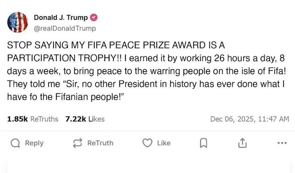 Насквозь коррумпированная шарашка под названием ФИФА придумала "премию мира ФИФА" и тут же вручила ее восьмидесятилетнему подростку, падкому на всякие цацки. И оно неудивительно, ведь президент ФИФА Инфантино - давний кореш Трампа, и он готов как угодно лизать ему задницу - не без выгоды для себя, разумеется.