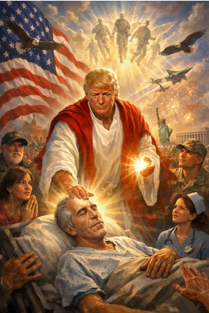 Трамп изображен в образе Христа, оживляющего мертвого педофила Джеффри Эпштейна