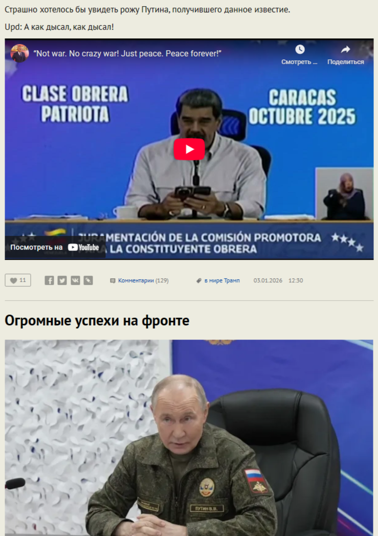 Пост Трампа. Утверждает, что они захватили Мадуро с женой и уже их вывезли из страны. Интересно, куда.
