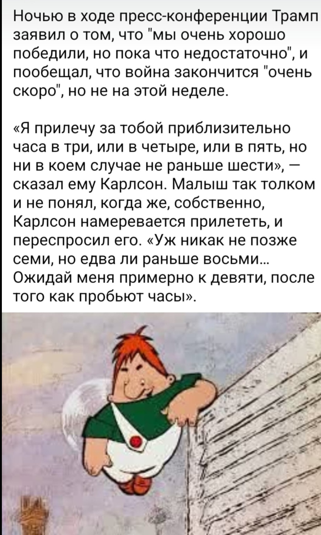Трамп хочет уже победить, но ещё не может. Злой Нетаньяху войну не прекращает, а даже наоборот, продолжает. Трамповские воеводы ни с кем заранее толком, похоже, не договорились о порядке ведения боевых действий и теперь каждый дует в свою дуду. Трампу всё это надоело, он хочет объявить победу - это понятно. Но ведь его спросят свои же, в чем заключается победа. Дорогая нефть - это, конечно, хорошо для кого-то США, но не для всех. Т.е. закрытый пролив и пострадавшие страны залива - это не то, как для большинства должна выглядеть победа. А в смысле флагофтыка в Иране, где угодно, - никаких побед не наблюдается.