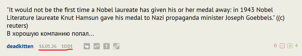 Мария Корино Мачадо передала Трампу свою Нобелевскую премию мира, этот парень ее принял, теперь наверняка повесит в Овальном кабинете и будет всем рассказывать, что он получил Нобелевку, с него станется. И ведь не понимает, каким клоуном он при этом выглядит, фантастика просто!