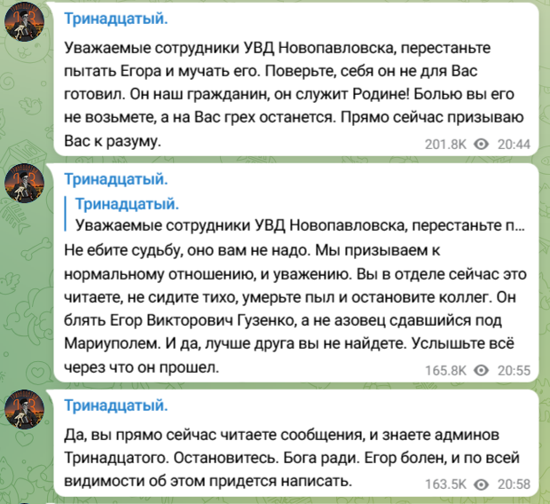 Потом в его ТГ пошли слухи, что Гузенко менты пытают. Да-да, настоящего патриота - ну как это? Ладно бы еще пытали всяких черножопых, азовцев и эту либеральную сволочь, но Егора-то за что?