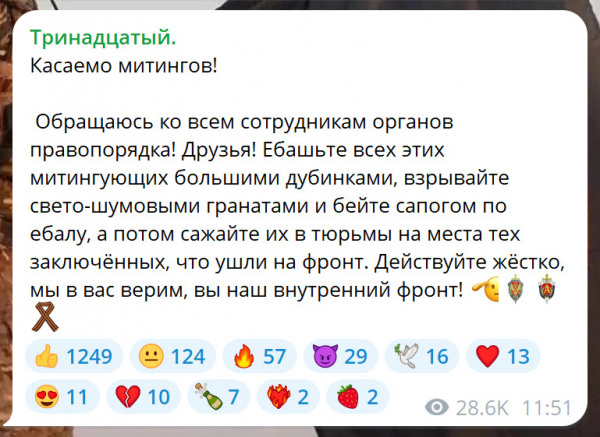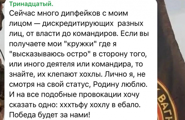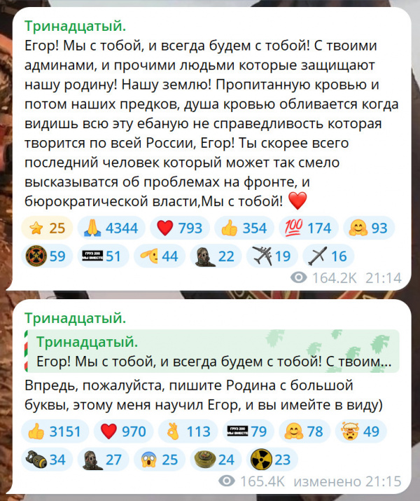 Есть такая Z-гнида "Тринадцатый", он же Егор Гузенко. Большой, знаете ли, патриот, на его ТГ подписано более 300 тысяч человек. Егор - парень горячий, иногда позволяет себе критиковать начальство, что начальством не приветствуется.