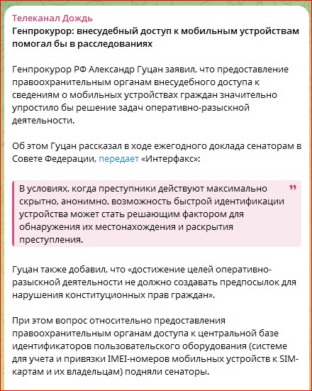 Генпрокурор РФ Александр Гуцан заявил, что предоставление правоохранительным органам внесудебного доступа к сведениям о мобильных устройствах граждан значительно упростило бы решение задач оперативно-разыскной деятельности.
