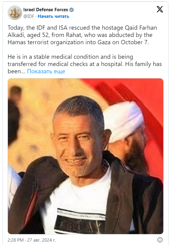 ЦАХАЛ провел сложную операцию по спасению очередного заложника - это гражданин Израиля Фархан Алькади, он араб, бедуин, мусульманин. ХАМАС его держал 11 месяцев в заложниках.
