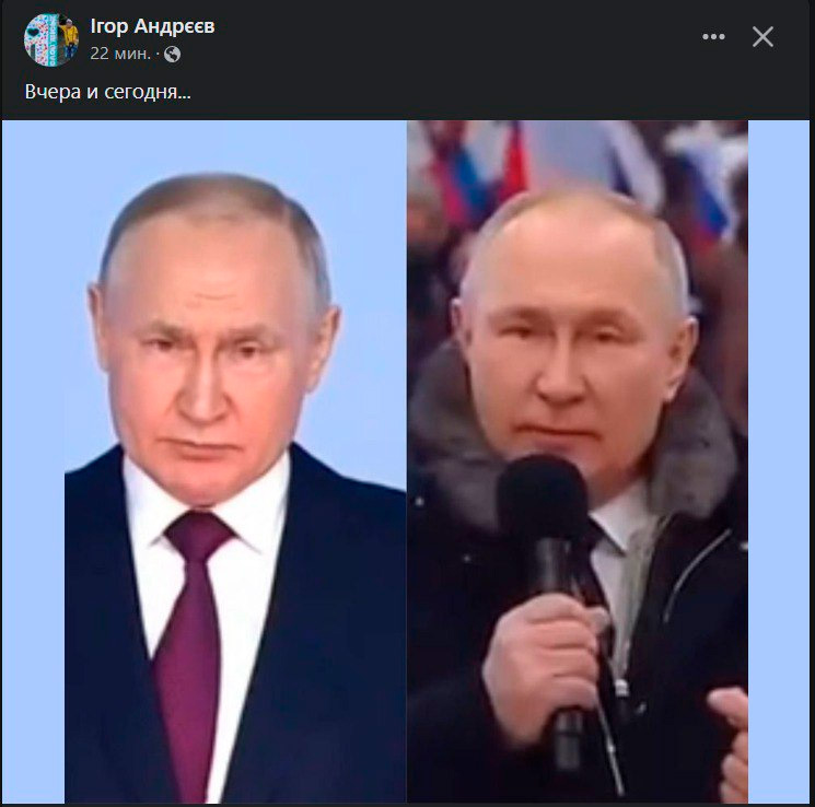 Можно долго сравнивать фото Путина от 21 и от 22 февраля, как это сделали вот здесь. И там видны явные отличия - волосы на голове, морщины, щеки (прям заметно отличаются).