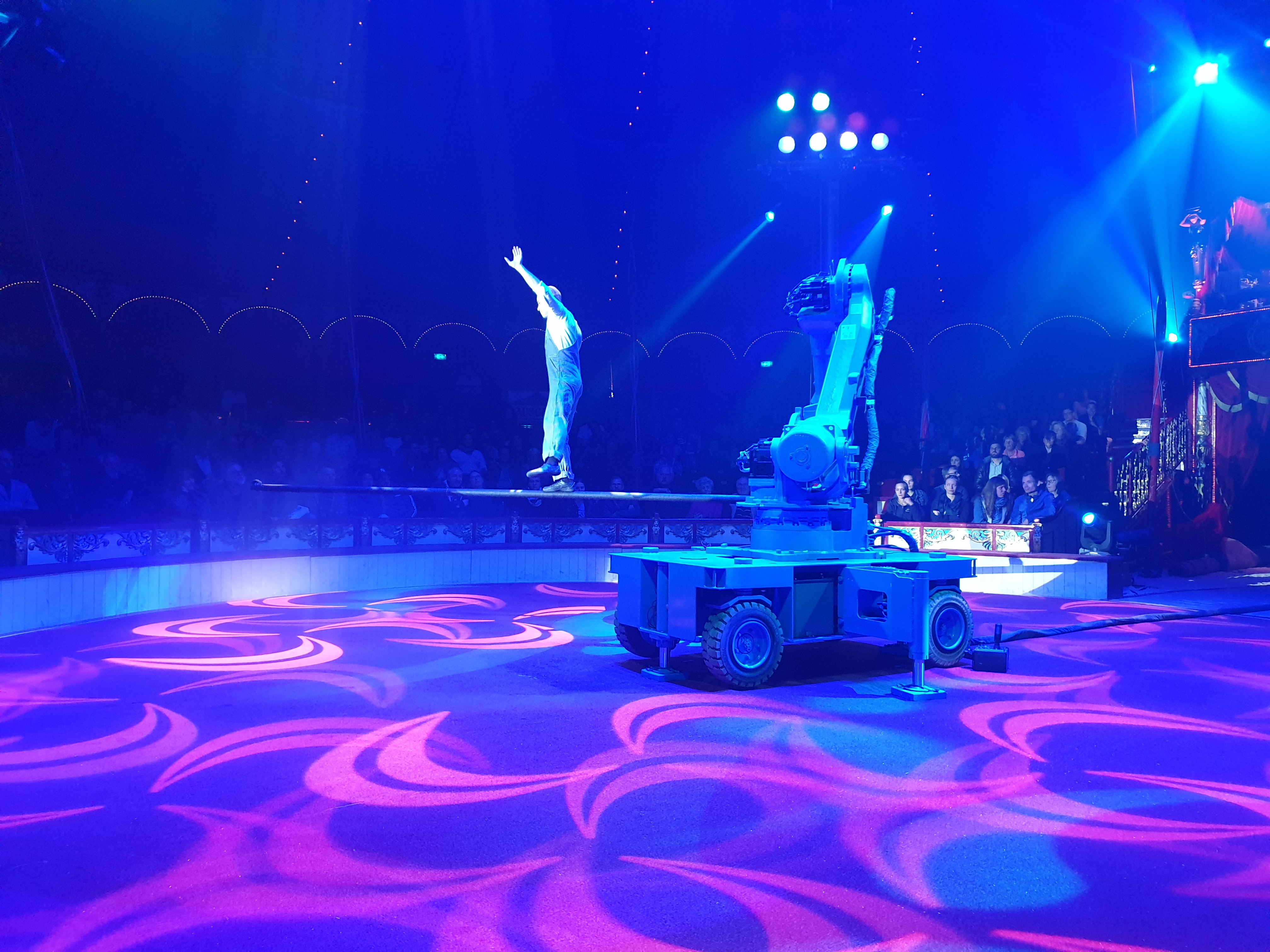 Был на этой неделе в цирке Roncalli, там тоже был номер с агрегатом, который крути шестом и акробат на нём... Но роботом я бы его не назвал, так как управлял им с помощью джойстика ассистент стоящий у выхода на арену