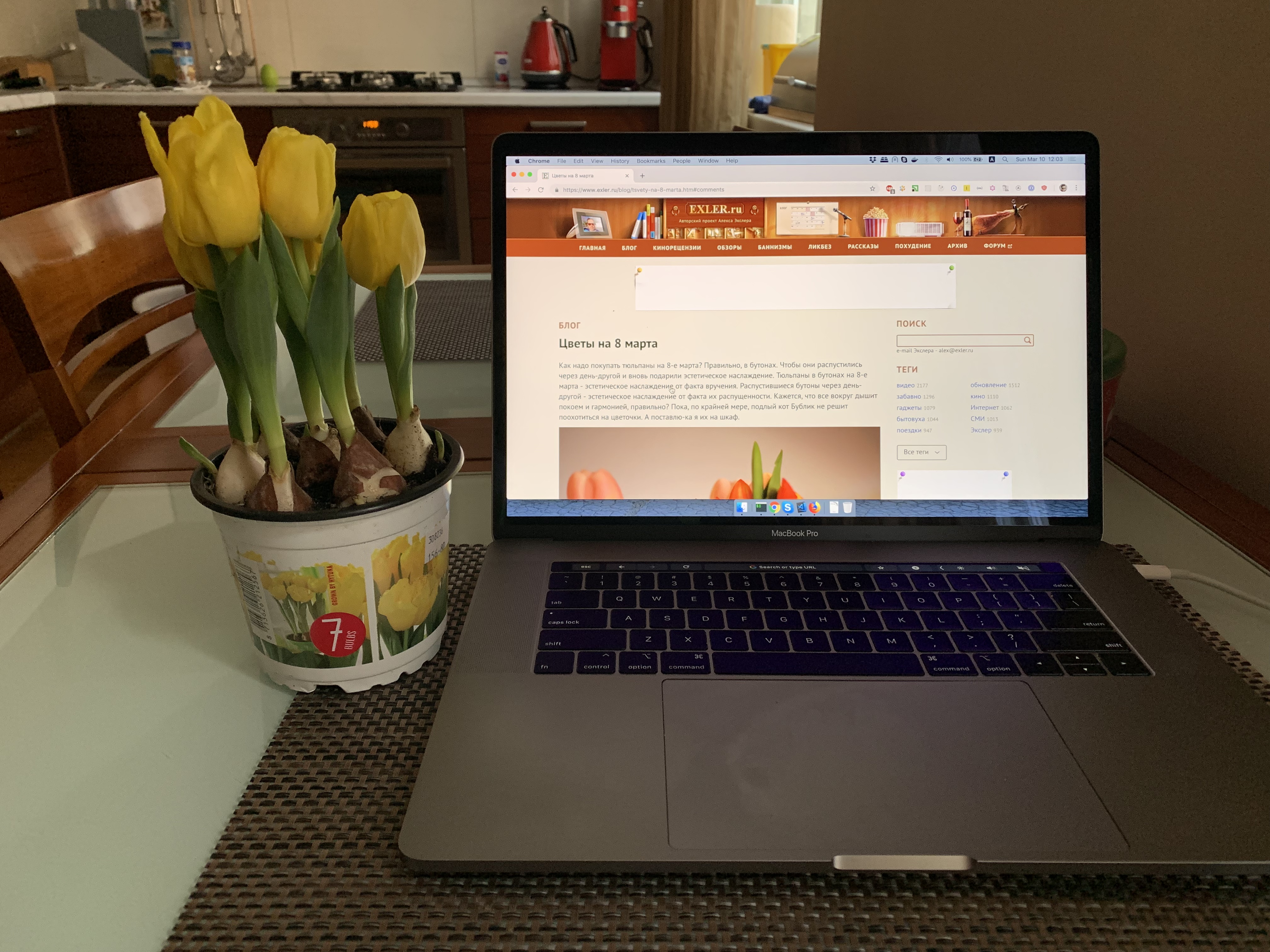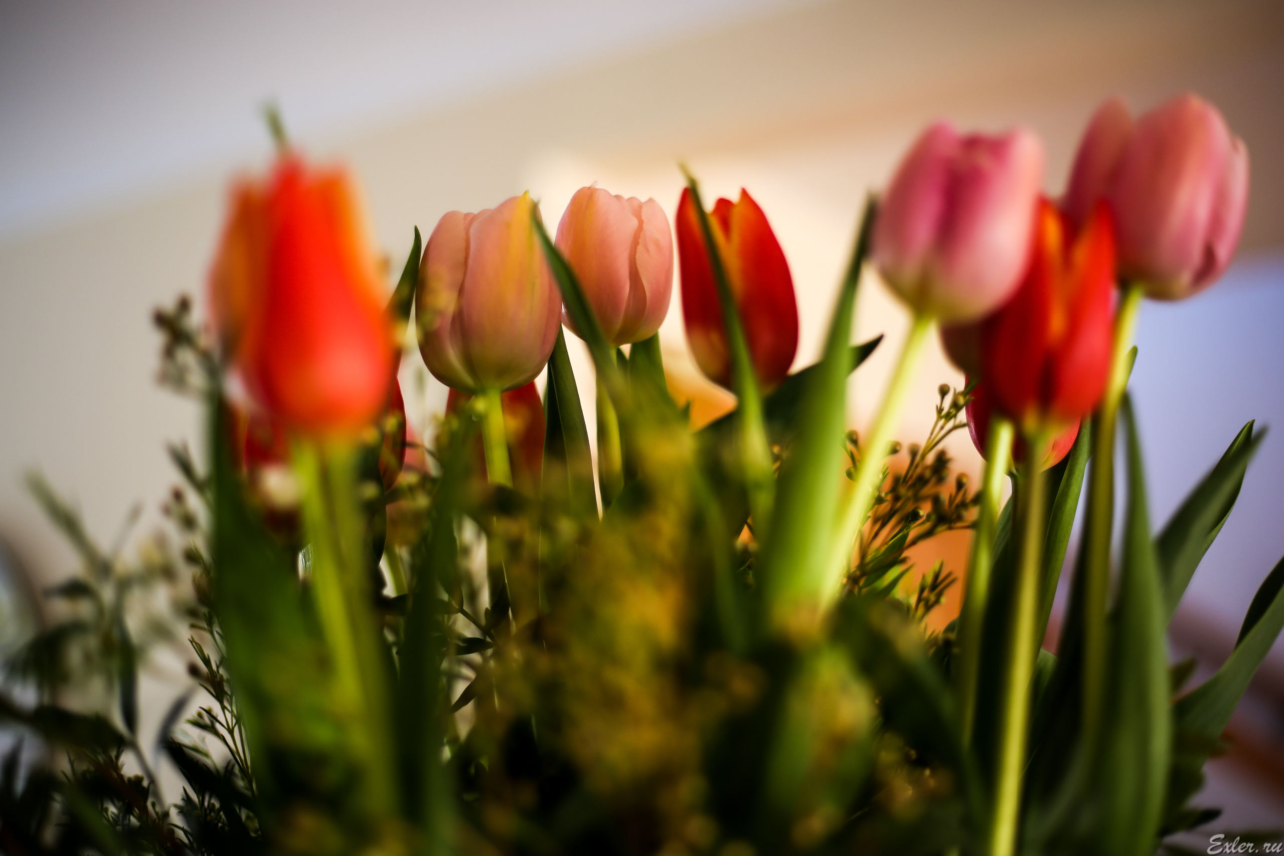 Как надо покупать тюльпаны на 8-е марта? Правильно, в бутонах. Чтобы они распустились через день-другой и вновь подарили эстетическое наслаждение. Тюльпаны в бутонах на 8-е марта - эстетическое наслаждение от факта вручения. Распустившиеся бутоны через день-другой - эстетическое наслаждение от факта их распущенности. Кажется, что все вокруг дышит покоем и гармонией, правильно? Пока, по крайней мере, подлый кот Бублик не решит поохотиться на цветочки. А поставлю-ка я их на шкаф.