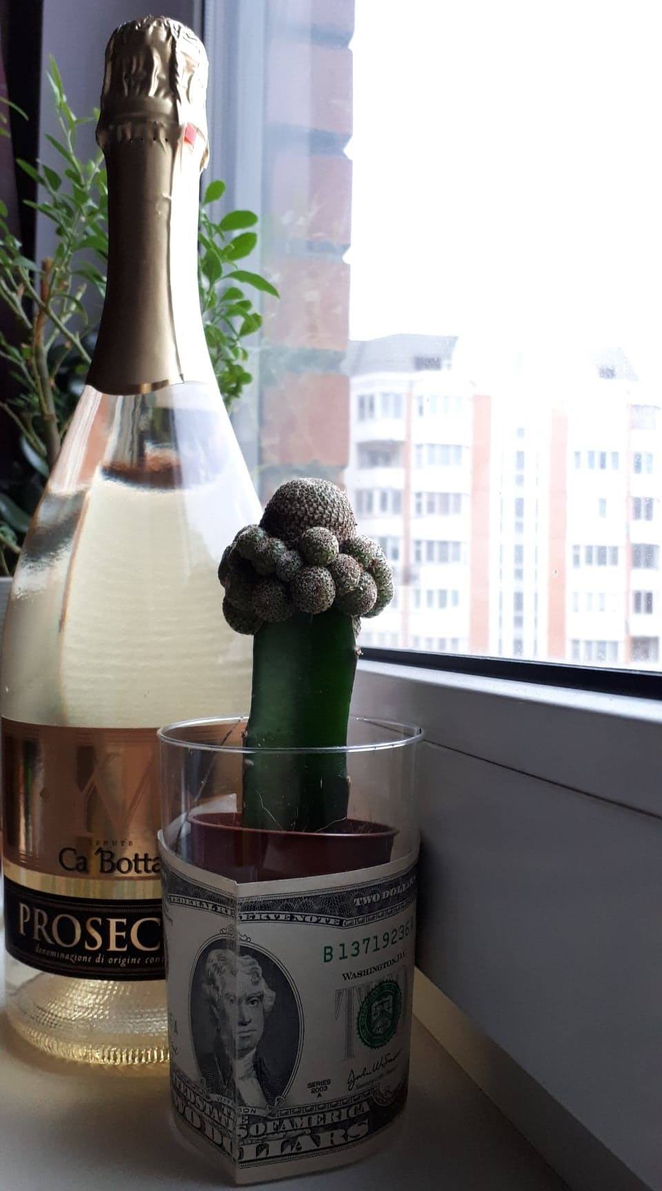 а не парился - купил просто кактус прикольный и 2 бакса вручил (правда потом обратно их забрал и вернул в паспорт ))) да и котик ее такой жрать побоится)