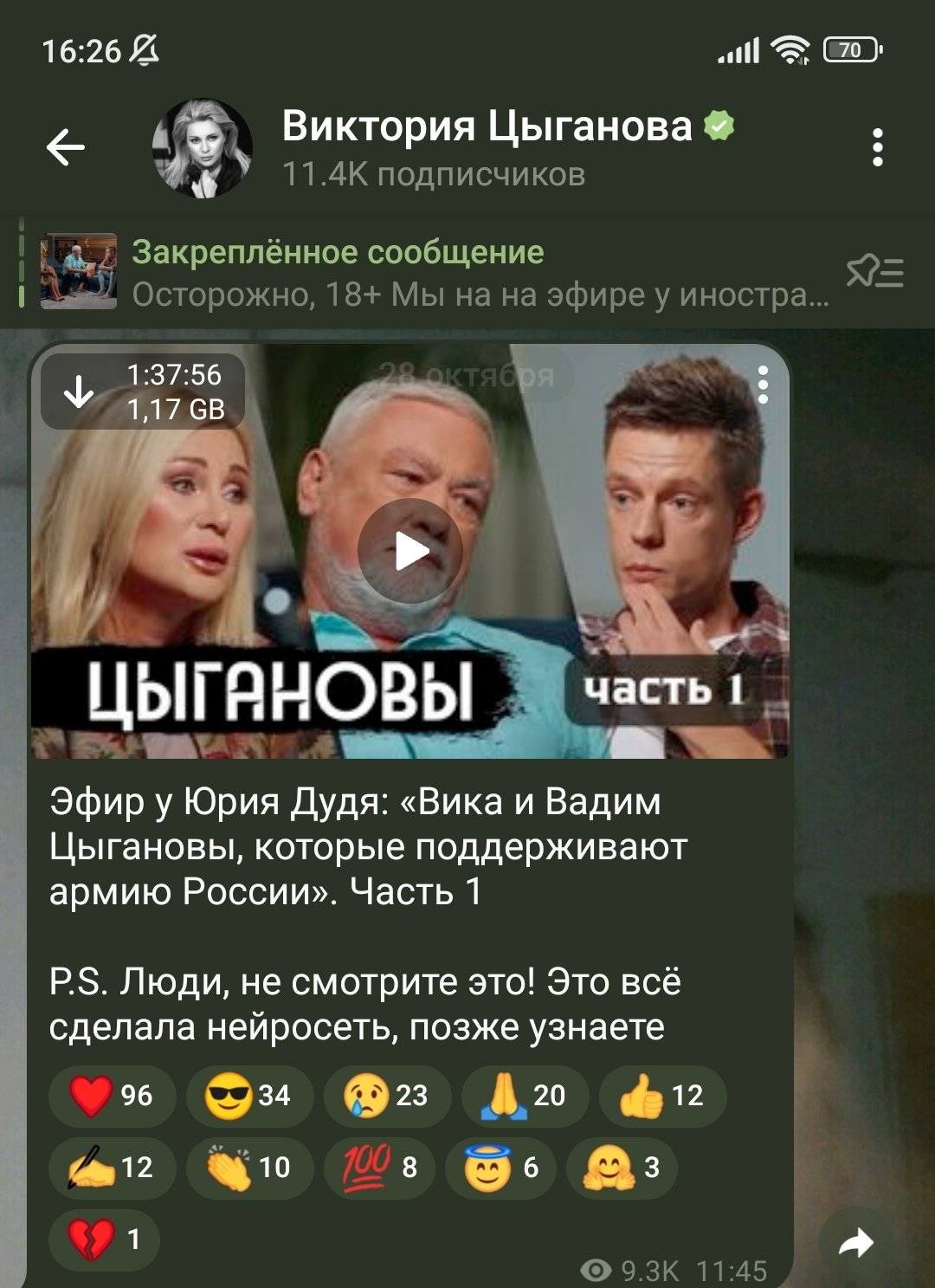 Певица Вика Цыганова опубликовала в телеграм-канале интервью Юрию Дудю (иноагент) с припиской, что это фейк. "Люди, не смотрите это! Это всё сделала нейросеть, позже узнаете. Это правда не мы, нейросеть и технологии deepfake…", - написала она.