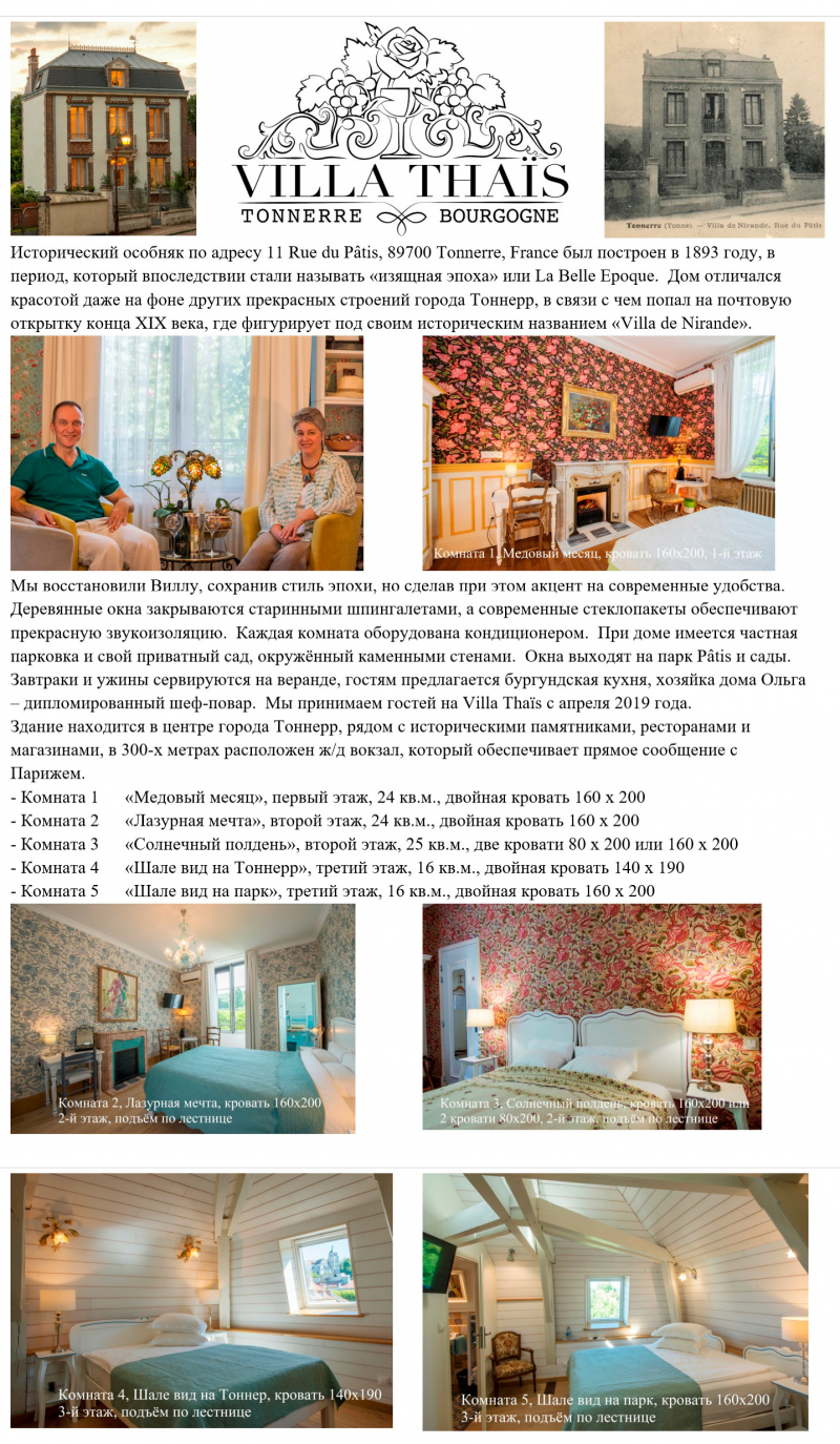 Координаты для связи, для различных уточнений, для бронирования - писать на почту Юрию villatonnerre@gmail.com, связываться через его Фейсбук или в Телеграм "Villa Thais Tonnerre" (@villathais). Если есть какие-то вопросы ко мне, то писать на мой обычный адрес toffler@gmail.com.