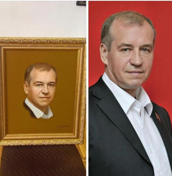 Разумеется, иркутский губернатор при этом также не остался без портрета киста мэтра. Фоточка из Википедии, поносный фон в MS Paint, портретик из принтера - художественный метод себе не изменяет.