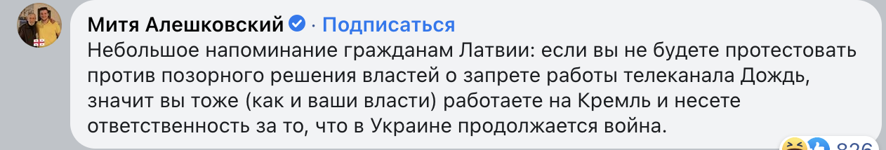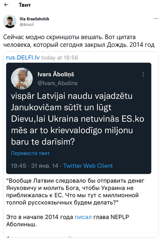 А внизу цитата Ивара Аболиньша, закрывшего Дождь, от 2014-го года. Но во всех грехах мира виноват, конечно же, Дождь, смотрите не перепутайте.