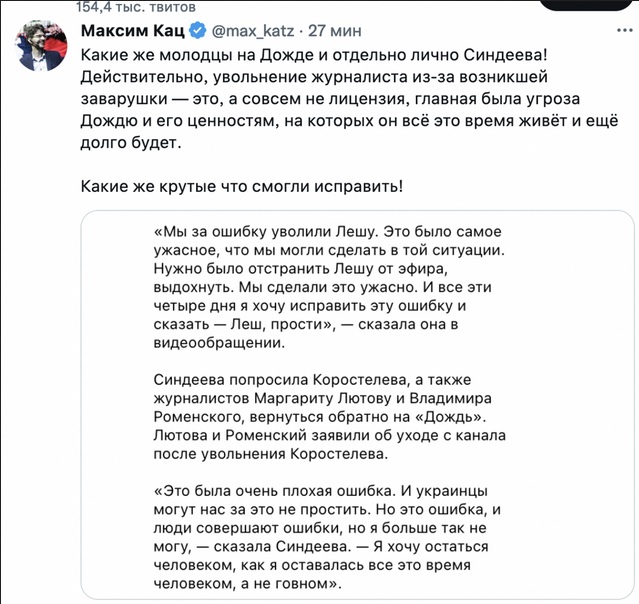 Да, кстати. Уволить само собой подразумевалось, но после этого рассуждать что решение далось нам тяжело, это была отличная передача и чисто оговорился бывает это непрофессионально и сыграло роль последней капли. Если бы Дождь действительно хотел остаться в Латвии нужно было бы как минимум закрыть телеграм Коростелева, публично извиниться и обещать больше так не делать.