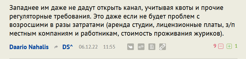 Это к тому, что я не понимаю, зачем им латвийская лицензия на вещание и вообще легализация именно в Латвии. Латышский язык и закон о госязыке - это "священная корова" в Латвии. При этом следование закону (а именно перевод и всего на латышский) - это огромная нагрузка для канала, который явно не в лучшем финансовом положении. Тот факт, что в Латвии русский очень хорошо понимают не меняет требований закона. Я бы назвала это наивностью, но это пахнет очень сильно старой доброй имперскостью.