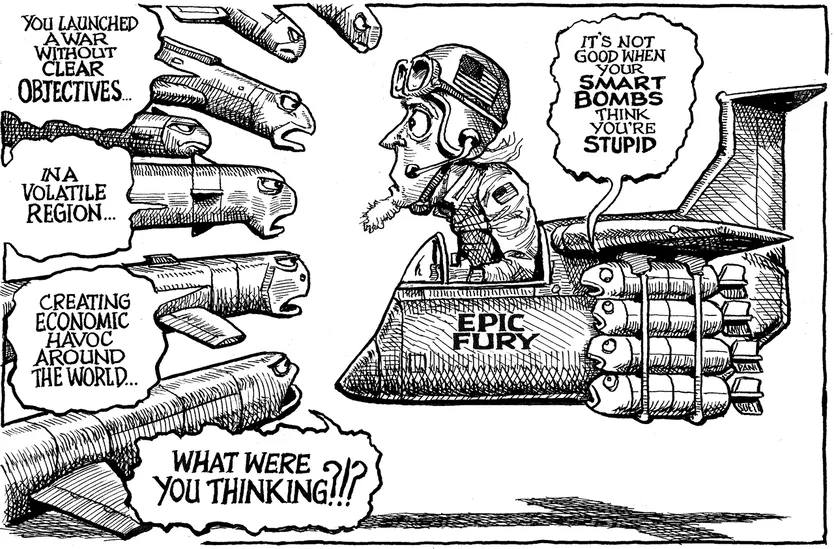 Во-вторых, никто не знает, каковы же на самом деле стратегические цели этой кампании. Если не считать задачи по обеспечению свободного прохода через Ормузский пролив, то каков конечный замысел? Смена режима? Сдерживание? Урегулирование путем переговоров? Трамп об этом не говорит. Судя по всему, он и не может сказать, поскольку сам этого не знает.