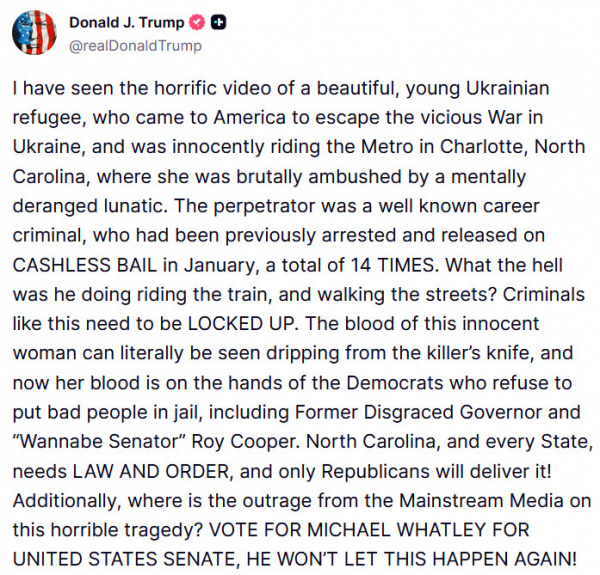 Я видел ужасающее видео, на котором запечатлена красивая молодая украинская беженка, приехавшая в Америку, чтобы спастись от жестокой войны в Украине, и невинно ехавшая на метро в Шарлотте, Северная Каролина, где она была жестоко убита психически неуравновешенным маньяком. Преступник был известным рецидивистом, который ранее был арестован и освобожден под залог без наличных средств в январе, в общей сложности 14 раз. Какого черта он делал в поезде и на улицах? Такие преступники должны быть ЗАКЛЮЧЕНЫ. Кровь этой невинной женщины буквально капает с ножа убийцы, и теперь ее кровь на руках демократов, которые отказываются сажать плохих людей в тюрьму, в том числе бывшего опального губернатора и «самозванного сенатора» Роя Купера. Северная Каролина и каждый штат нуждаются в ЗАКОНЕ И ПОРЯДКЕ, и только республиканцы могут это обеспечить! Кроме того, где возмущение основных СМИ по поводу этой ужасной трагедии? ПРОГОЛОСУЙТЕ ЗА МАЙКЛА УОТЛИ В СЕНАТ США, ОН НЕ ДОПУСТИТ, ЧТОБЫ ЭТО ПОВТОРИЛОСЬ!
