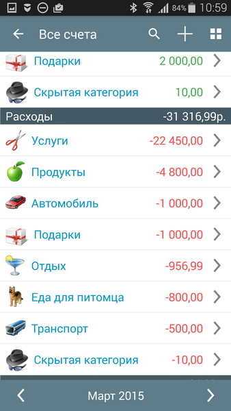 Ну и в результате - вы видите все свои расходы и доходы за определенные месяцы, разбитые по категориям и подкатегориям. Все финансы - под контролем!