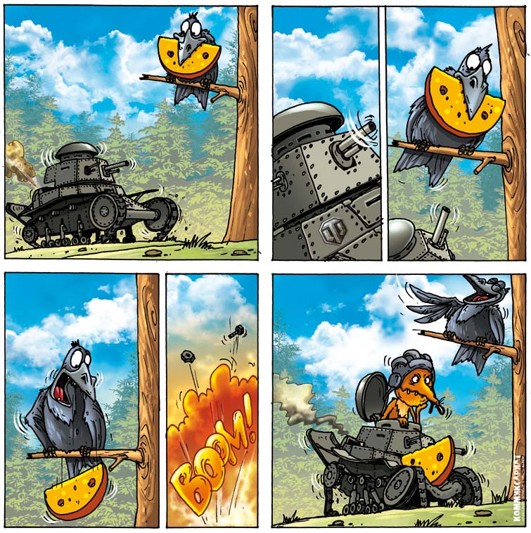 Сидит ворона на сосне, держит в клюве сыр. Смотрит — вдали лиса бежит. Тут ворона начала мечтать: сейчас подбежит лиса, будет меня комплиментами засыпать, говорить какие у меня перья красивые, какой клюв, скажет что жить не может не слушая мой голос, попросит что-нибудь спеть…