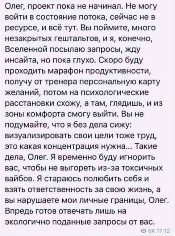 Наверное, я очень мало встречался с такими коучерами/психологами и много - с попытками отмазаться от обещанной работы:) потому и прочтения разные.