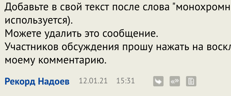 Чтобы два раза не вставать: Алекс, вы пишете в заметке www.exler.ru про то, что мы можем пожаловаться на собственный коммент, но движком сайта это не предусматривается. Под собственным комментарием я вижу лишь кнопки "Ответить", "Цитировать" и "Редактировать". Поэтому я и попросил пожаловаться других участников обсуждения, ведь я сам этого сделать не могу.