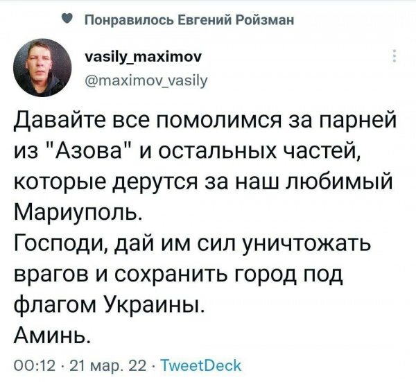 Я считаю, что это является основанием для привлечения самого Григорьева к уголовной ответственности за клевету. Мариуполь же уничтожается жидобендеровцами, правильно? Ройзман лайкнул призыв остановить уничтожение города. При чем тут вообще российские войска? Они разве уничтожают Мариуполь? Григорьев это хочет сказать? Я прошу Игоря Викторовича провести немедленную проверку в отношении этого Григорьева. Он явно распространяет какие-то фейки о миротворческой гуманитарной спецоперации.