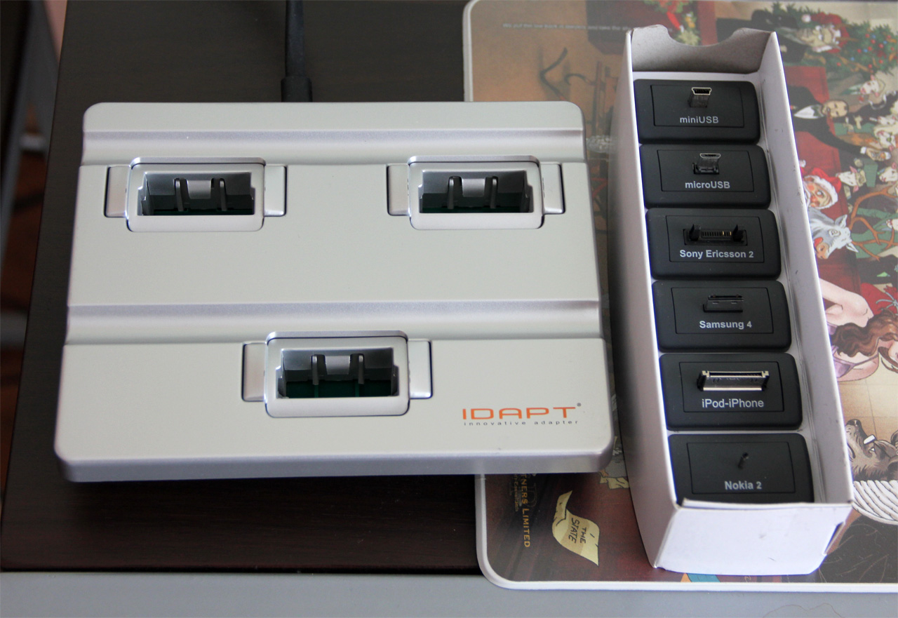 Давно хотел такую штуку, а то замучила эта каша из проводов на столе. Подобных адаптеров вообще выпускается немало, но этот показался наиболее удобным. Называется IDAPT i3, приехал из Штатов (традиционное спасибо магазину Reader-sony.ru). В комплект входит сам адаптер с тремя гнездами, а также набор из шести головок под разные устройства: iPod-iPhone, miniUSB, microUSB, Sony 2, Nokia 2, Samsung 4. Кстати, набор можно выбрать при покупке - там есть головки и под другие устройства, например, переходник для зарядки аккумуляторов.