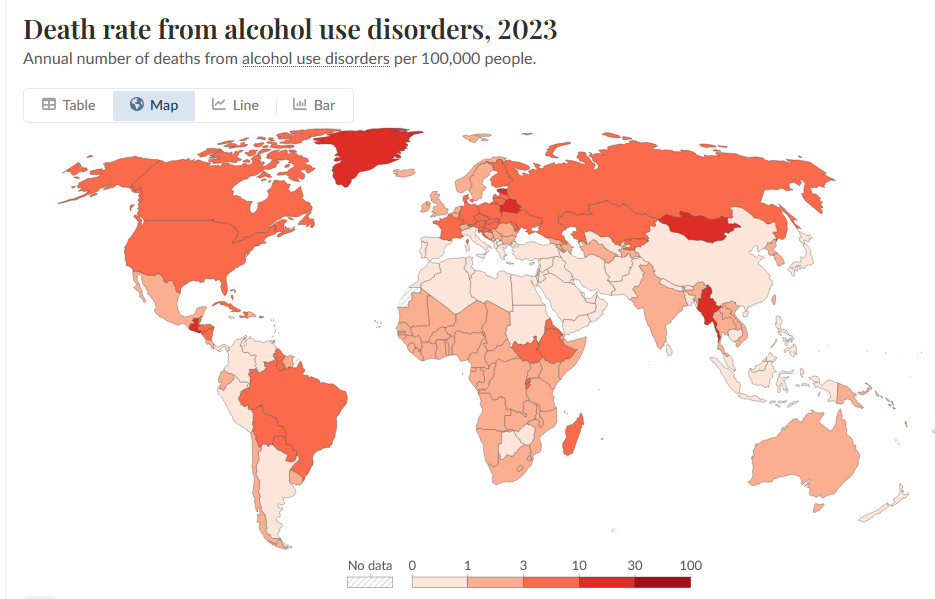 Ну, это в первую очередь зависит от того, что считать смертью от связанных с употреблением алкоголя -- в разных странах могут быть очень разные критерии.