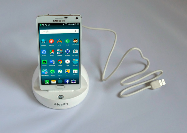 Ставим телефон в док-станцию, предварительно установив туда программу iHealth .