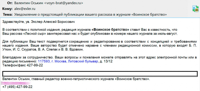 Поскольку это слишком странно даже для воинского братства и поскольку такие письма пришли как минимум еще нескольким писателям (в частности, Лене Каганову точно пришло), я думаю, что это просто типа такая раскрутка - мол, писатели возмутятся и напишут, а им рекламка.