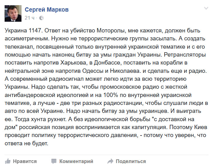 Он зверь просто, зверь! Представляете, если ретрансляторы поставить напротив Харькова, да еще и на корабли в нейтральной зоне, а оттуда будет биться за умы украинцев лично Сергей Марков - председатель межкомиссионной рабочей группы по международному сотрудничеству и публичной дипломатии в Общественной Палатке РФ, директор института политических исследований, кандидат политических наук?!!