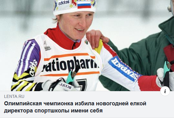 "Двукратная чемпионка Олимпиады-1998 в лыжных гонках Ольга Данилова избила новогодней елкой директора носящей ее имя спортшколы в городе Александров Владимирской области. Об этом сообщает издание «Новый город Александров»."