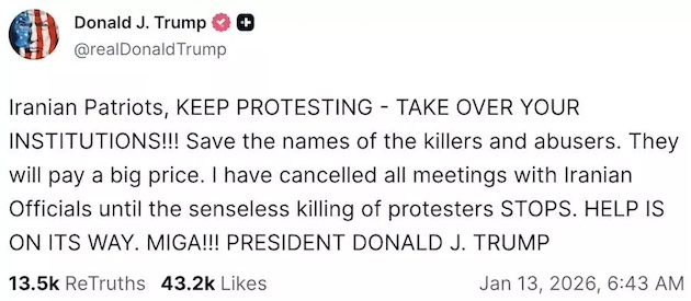 Если Иран расстреляет и жестоко убьёт мирных протестующих, как у них принято, Соединённые Штаты Америки придут им на помощь. Мы готовы к бою. Спасибо за ваше внимание к этому вопросу! Президент ДОНАЛЬД ДЖ. ТРАМП