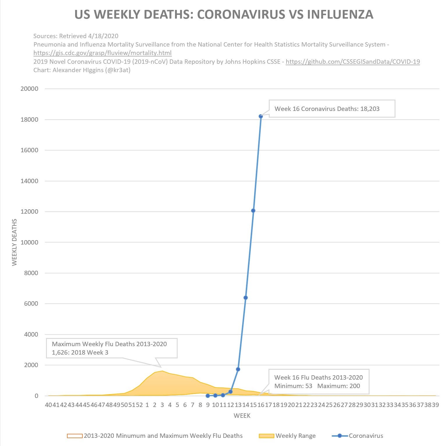 Если там выбрать state, то можно посмотреть статистику смертей по неделям по New York City и New York. В городе в среднем в неделю умирало 1000 человек, а в штате 2000. Видно, что прирост смертей пошел только с 12 недели и там и там. Если просуммировать все превышение, то получается 10.600 дополнительных смертей. Тут их - 18.300.