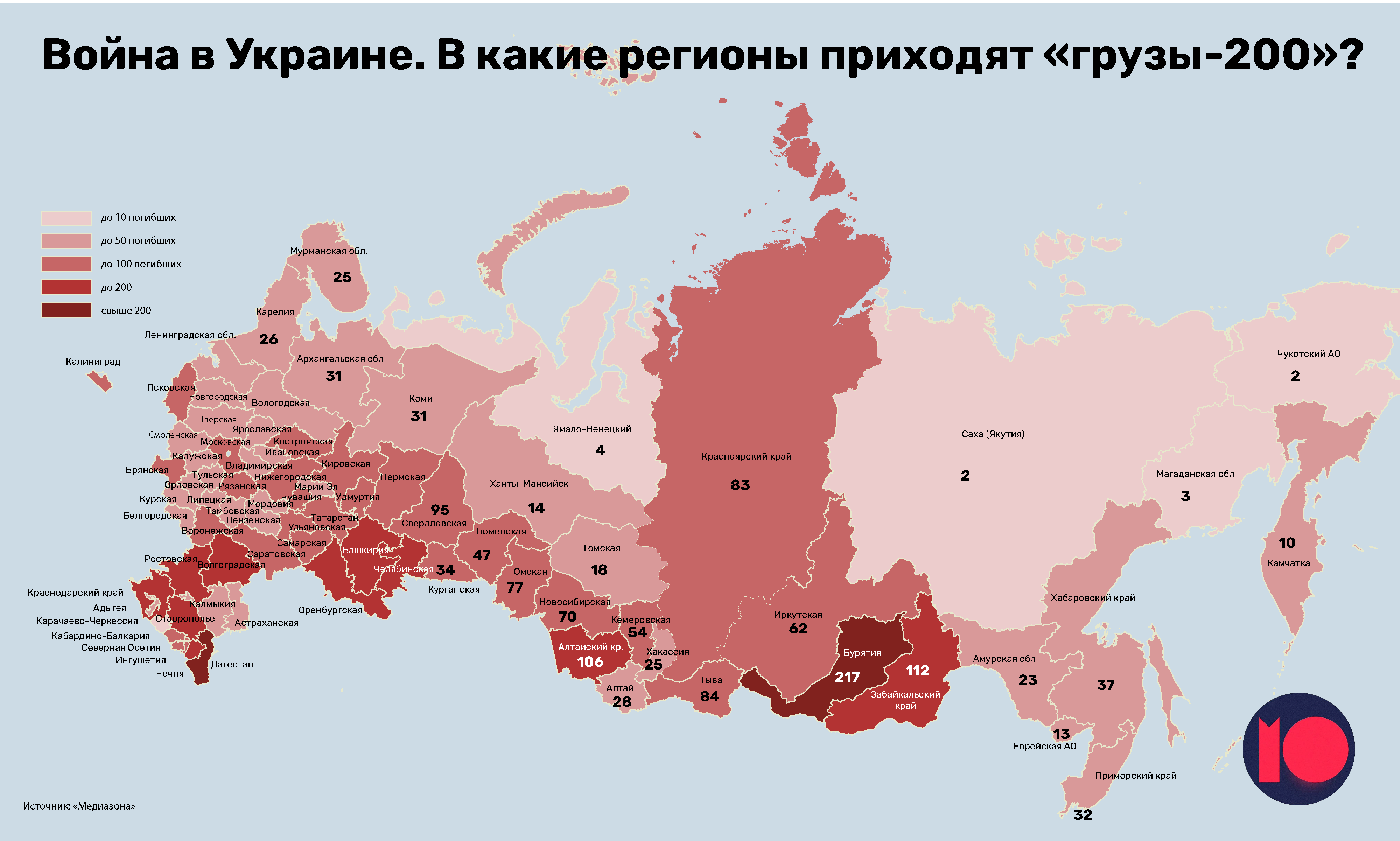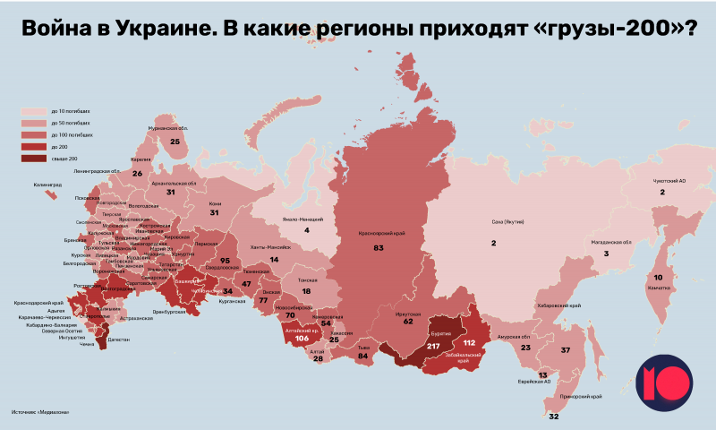 Риск погибнуть на украинской войне выше у жителей окраин и национальных республик. Это показывает составленная каналом «Можем объяснить» карта, основанная на официально подтвержденных данных о гибели военных из РФ в ходе украинской кампании. Эти данные собирают Русская служба BBC и Медиазона, составляющая свою карту с распределением этих цифр по регионам. Сейчас, по данным BBC, официально подтверждена гибель 4940 российских военных, на карте «Медиазоны», составленной по данным на 14 июля (как и на карте «МО») учтена информация о 4760 погибших. Это те люди, чья личность была верифицирована, известны их имена и фамилии, о них рассказали местные власти и СМИ.