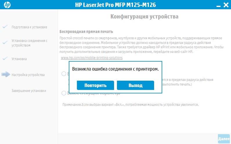 Потеряна, вашу мать, связь с принтером. По кабелю USB связь потеряна, потому что данная модель никакой WiFi не поддерживает - и слава богу, потому что я хорошо помню, что такое связь по WiFi с принтером HP, я это уже проходил.