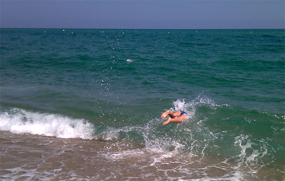 Сделал на пляже шикарный кадр - отважный пловец покоряет набежавшую волну.