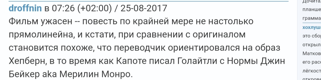 Было интересно. В 29:45 Уткин забыл фамилию Хепбёрн ("Девушка, которая играла Тиффани... красавица... с огромными глазами"), а Гордон и не знал ("Прошло мимо меня, ха-ха").