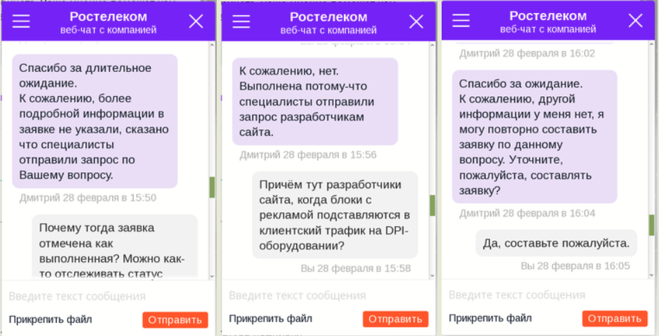 Так что тем, кто с подобным столкнулся, нужно бороться: писать соответствующие обращения в надзорные органы, прикладывая скриншоты вредоносного внедрения в интернет-трафик и скриншоты переписки со службой поддержки, в которых они подтверждают, что именно "Ростелеком" осуществляет это вредоносное внедрение. Что там у них написано в договоре - является юридически ничтожным на фоне того, что происходит прямое нарушение Законодательства РФ. Они в договоре могут написать, что "Ростелеком" по ночам имеет право вламываться в ваш дом - и что, от этого у них появится такое право, что ли?
