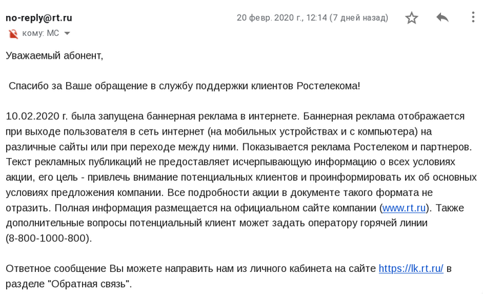 12 ноября 2019 года я получаю от Ростелекома следующее письмо